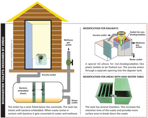The bio-digester is a spin-off technology product developed by scientists from the DRDE, Gwalior, and Defence Research Laboratory (DRL), Tezpur, to treat biological wastes of soldiers serving in the high altitudes of Ladakh and Siachen. Since 2012, Indian Railways has started to transform all on-board toilets into bio-toilets. With an average 18 million people travelling by train every day, Indian Railways is a lifeline but its toilets are in a pitiful state.
