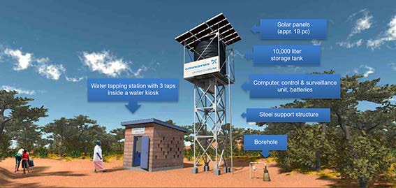 The model – a total solution water system with a solar-powered water pump, a water tank, a remote monitoring unit and an automatic tapping unit – also incorporates a payment facility, where the users pay for the water using smart cards and mobile banking.