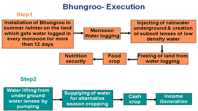 Biplab has introduced a five-stage process for solving the irrigation problem with the re-introduction of Bhungroo (meaning straw in Gujarati). This concept does not warrant farmers to pay anything upfront, instead, they agree to a five-year contract to repay the services of water logging-freeing and irrigation water through their cash crop.
