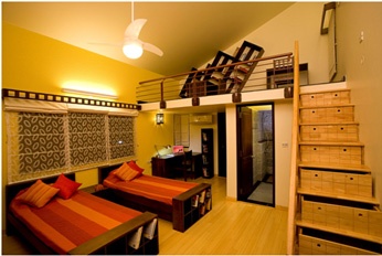 Interiors can be game-changing if the designer decides to work with materials that are ‘responsible’ and ‘eco-friendly’. This elegant kids’ room has the floors, the stairway, the furniture … all of it with non-forest timber. These are treated bamboo solid floors. The timber on the stairway railing, the treads and the bedsteads are treated acacia or rubber wood built to last. If you peer closely enough at the staircase, you will see the ingenuous drawers that children can use for keeping things. The window pelmets, the study desk, even the light                                                                                                          fitting is in designer non-forest timber.