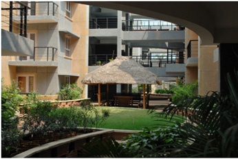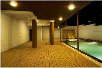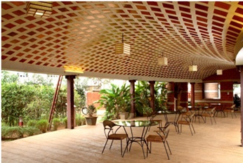 The silhouetted setting with the poolside as foreground is a charming club side amenity at the hugely acclaimed TZed Homes in Whitefield, Bangalore. The curved roof with wood surface for the roofing is a world-class design that adopts the traditional filler-block roof design for this roof surface in teak wood. In Centre of pic, look hard and you will see a large awning in a filler-block light-weight material above the library at this Club side.