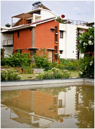 This campus in the bustling upmarket Whitefield parts is the poolside at TZed Homes. The tiered natural contour on the far side makes for an informal open-air theater; the pool is chemical-free; the rich green of the turf conceals an elaborate and compact network of boulder-filling at the sub-surface that acts effectively to avoid inundation. The entire area was scooped out from the level of the top of that tree at centre-stage, and the massive quantum of earth was used to make 550,000 blocks that were used as building blocks for the entire apartment complex of TZed Homes. Conceived in 2003, the homes were handed over about ten years ago. The campus has organically grown to be one of the most coveted apartments in India today.