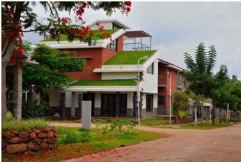 Barring a 3-meter road made of debris for sub-grade preparing, the entire stretch of roads in a 25-acre campus serves as an example of letting lands breathe. Turfed roofs make for natural, cool spaces with the grass being offered moisture, not water, with a sprinkler system that is low on cost and on energy.