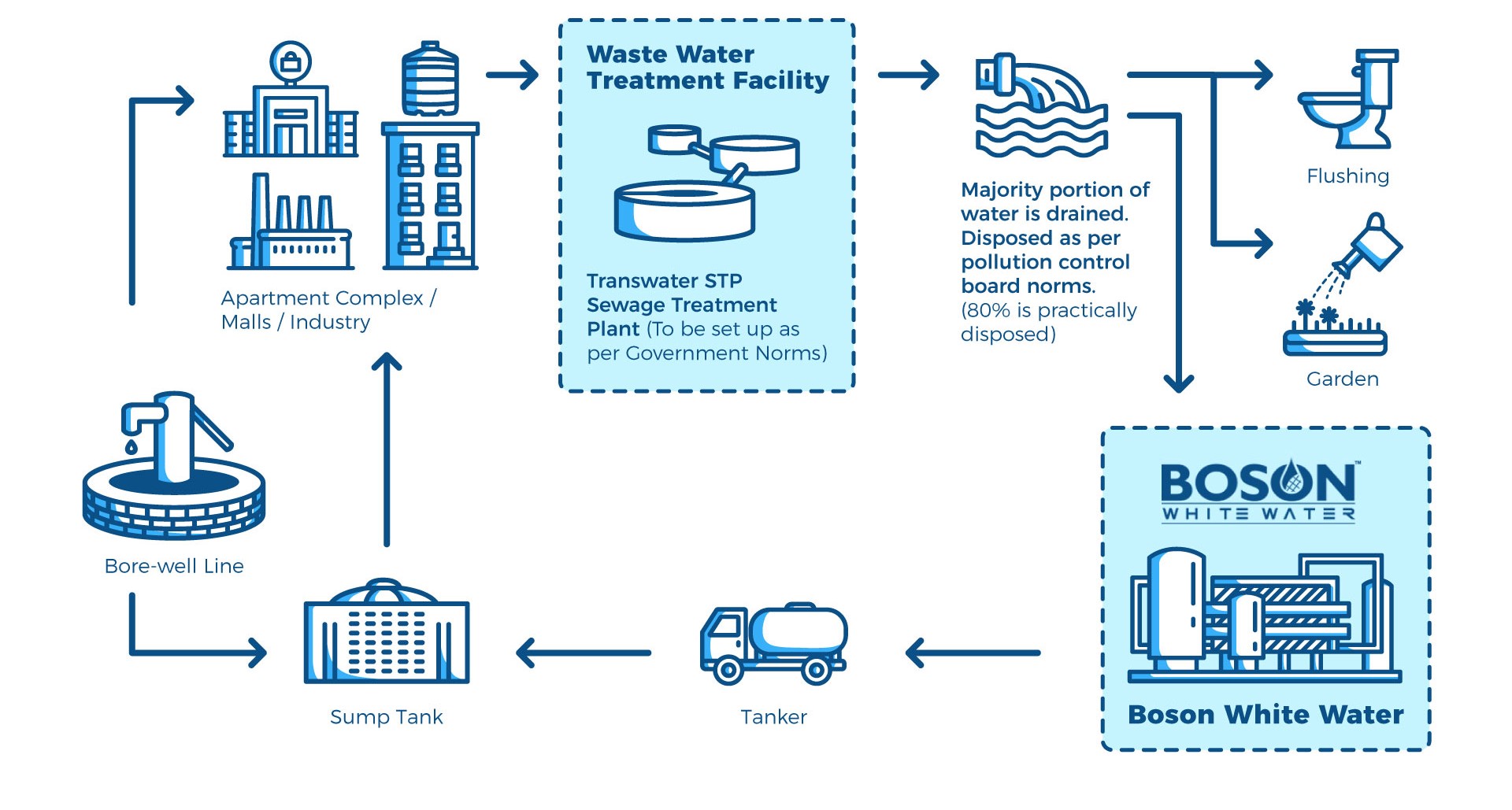 This is where Boson Whitewater comes in. They treat this excess STP water at source, converting it to potable-quality water. This water can become a significant source of water to the city. Boson Whitewater is on a mission to Create a Decentralized Wastewater Recovery Infrastructure for India. It is India’s 1st company to create a proven, viable and sustainable circular economy in wastewater solutions.
