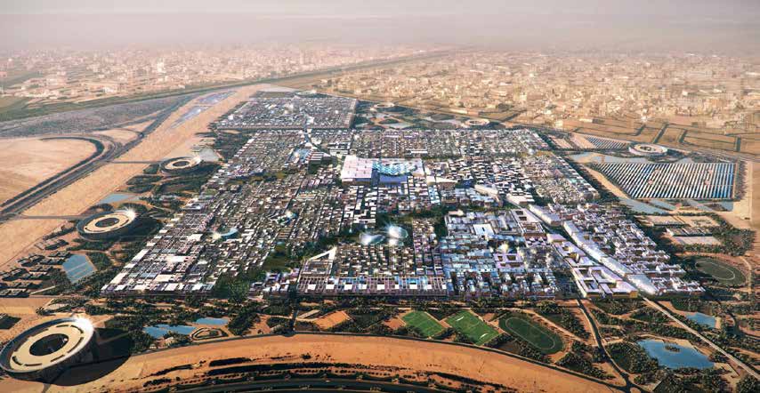 From a distance, the city looks like a cube. The temperature in the streets is generally 15 to 20°C cooler than the surrounding desert. The temperature difference is due to Masdar’s unique construction. A 45-meter high wind tower modeled on traditional Arab designs sucks air from above and pushes a cooling breeze through Masdar’s streets. The site is raised above the surrounding land to create a slight cooling effect. Buildings are clustered close together to create streets and walkways shielded from the sun. Masdar City was designed by UK fi rm Foster and Partners. Recognizing the efforts of UAE leaders, the International Renewable Energy Agency has decided to move its headquarters to this city.
