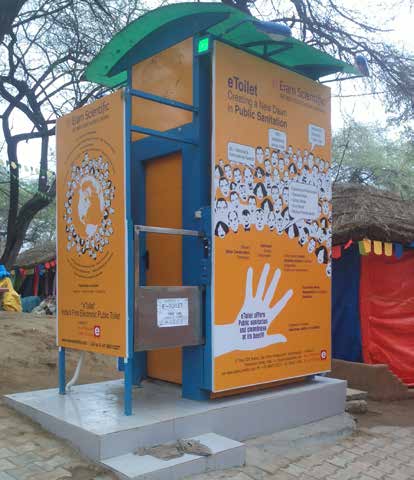 eToilet is a revenue-generating sanitation model with a unique ambience and is an innovatively-designed and engineered public sanitation model to suit Indian urban locations. This innovation involves unmanned operations and thus ensures easy and continual operation of the toilets while minimizing unnecessary maintenance costs. eToilets are built of stainless steel or mild steel enclosures and have electronic systems for enhancing user experience and for tracking the health status of eToilets. eToilets have automated access control systems, sensor enabled water minimization, selfwashing and fl oor wash mechanisms. The well-lit interiors with LED lights glow only when a person enters and has ample natural ventilation as well as offers privacy and safety.