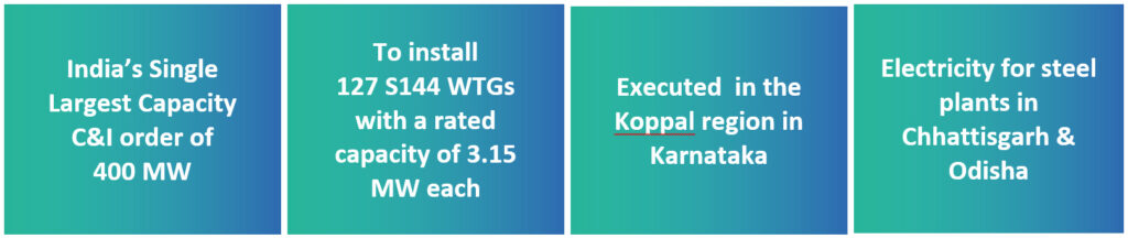 Suzlon will supply 127 state-of-the-art wind turbine generators (WTGs) with Hybrid Lattice Tubular (HLT) towers, each having a rated capacity of 3.15 MW in the Koppal region of Karnataka. The power generated will be used for captive consumption in Steel Plants in Chhattisgarh and Odisha, boosting their operational sustainability while advancing India’s green energy goals.