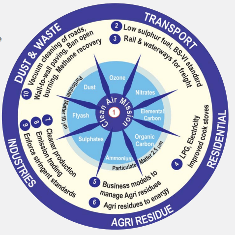 1. Launching a National Clean Air Mission for Multiscale and Cross-sectoral Coordination This Clean Air Mission [CAM-INDIA] should have the mandate to implement government policies for air pollution mitigation across several ministries dealing with transport, power, construction, agriculture, rural development, and environment, as well as across city and state jurisdictions. The targets for the CAM-INDIA are particles referred to as PM2.5 to PM10 and Ozone. The term PM (particulate matter) denotes a collection of difference species of particles in the air, while the 2.5 or 10 refers to the radius of the particle in dimension of micrometer (millionth of a meter). The most important ones are: ammonium sulphates, ammonium nitrates, black carbon (elemental carbon), organic carbon, fly ash, and dust (mineral and road dust). To emphasize the point about cross-sectoral coordination, the ammonia in ammonium sulphate comes from agriculture while the sulphates come from sulphur dioxide (SO2) emissions from the power and industrial sector. The per cent contribution of each of these particles to PM2.5 or PM10 differs from one location to another, from month to month and at times from one village or city to the next and even, from one day to the next, implying that the science of monitoring, determination of emission inventories, and modeling is crucial to evaluate the efficacy of policies.