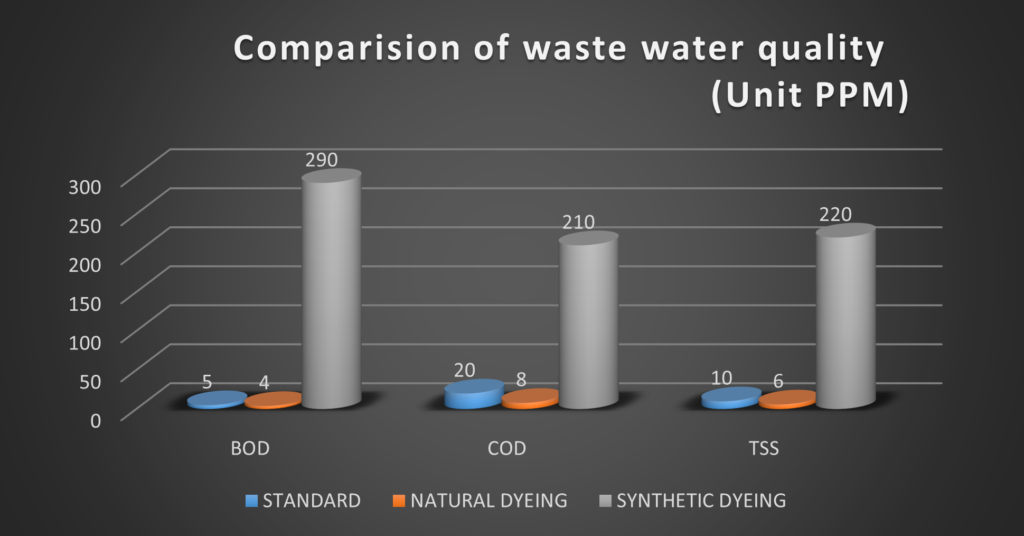 Natural dyes are derived from natural materials are susceptible to microbial action. This makes it 100 % biodegradable. In comparison to synthetic dyes, the dye molecule of natural dye has low tinctorial value. Thus, natural dyes are more susceptible to the action of light and water than a synthetic one. Effluent produced during its dying is easily treatable and less expensive than received form synthetic dyes